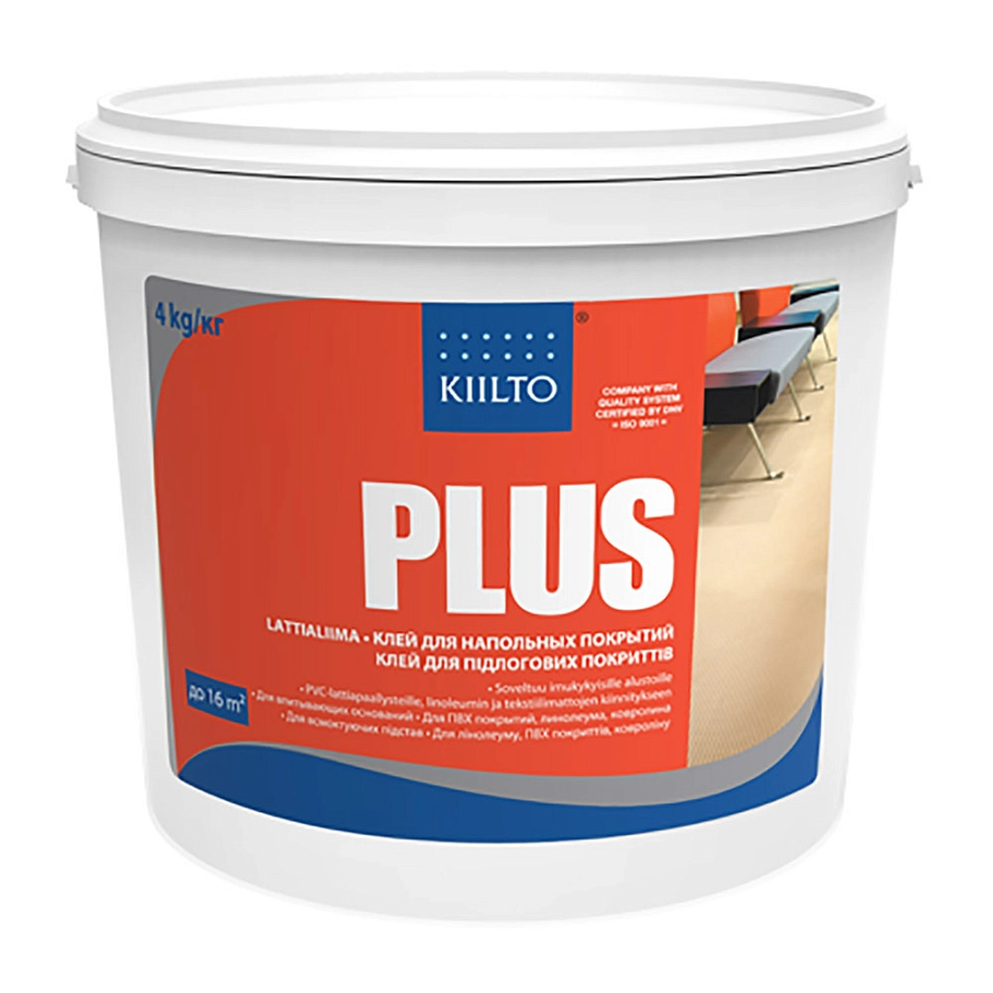 Kiilto 2 Plus представляет собой не содержащий растворителей акриловый клей для приклеивания различных напольных покрытий - рулонных ПВХ покрытий в том числе на вспененной основе, ПВХ и кварцвиниловых плиток, пробковых плиток на ПВХ основе и ковровых плиток на различных основах, всех видов линолеума, ковролина и иглопрошивных покрытий, а также пластмассовых облицовок для стен толщиной более, чем 0,6 мм к впитывающим и невпитывающим влагу поверхностям, в сухих и влажных помещениях. Применим также для приклеивания натурального линолеума к впитывающим влагу поверхностям.