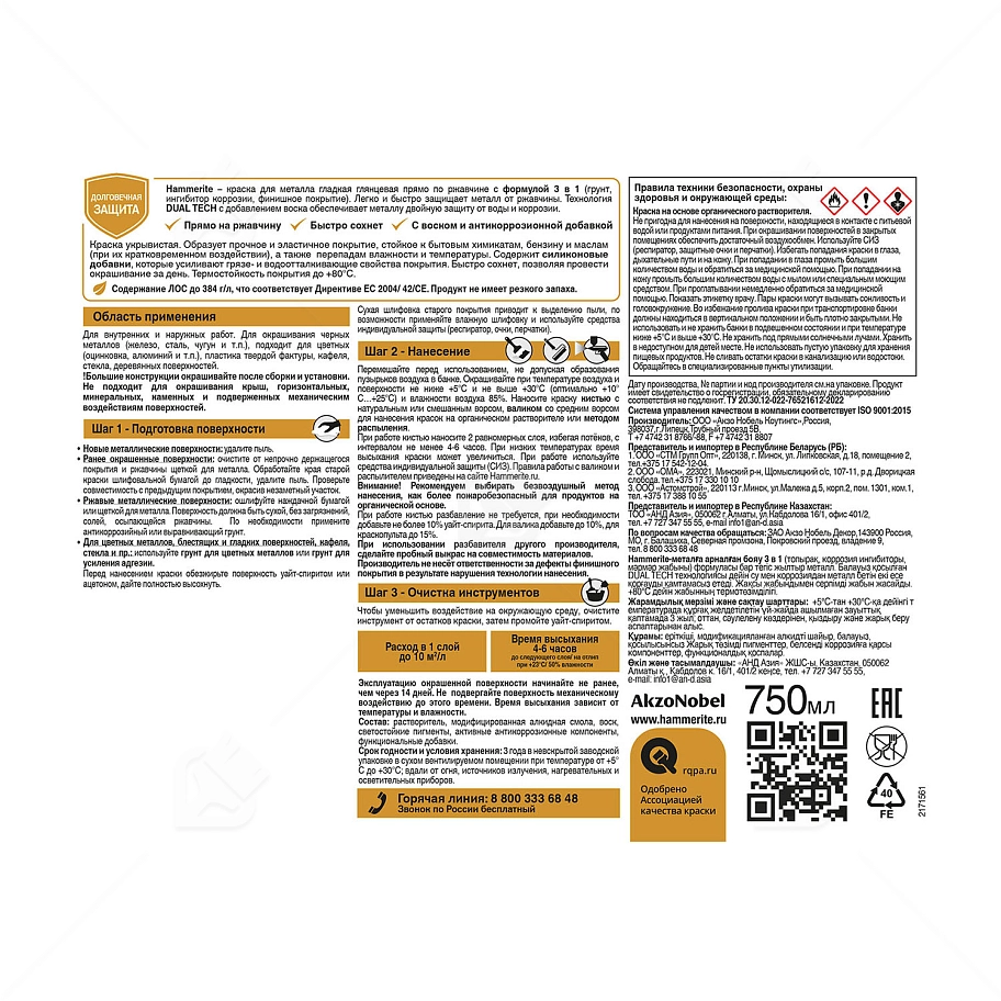 Благодаря технологии Dual Tech c добавлением воска, Hammerite обеспечивает двойную защиту металлической поверхности от воды и коррозии до 8 лет. Образует износостойкое и эластичное покрытие, которое остается устойчивым и не растрескивается при перепадах влажности и температуры внутри и снаружи помещений. hammerite обладает чешуйчатой структурой, служащей дополнительным барьером на пути кислорода и воды к металлической поверхности.