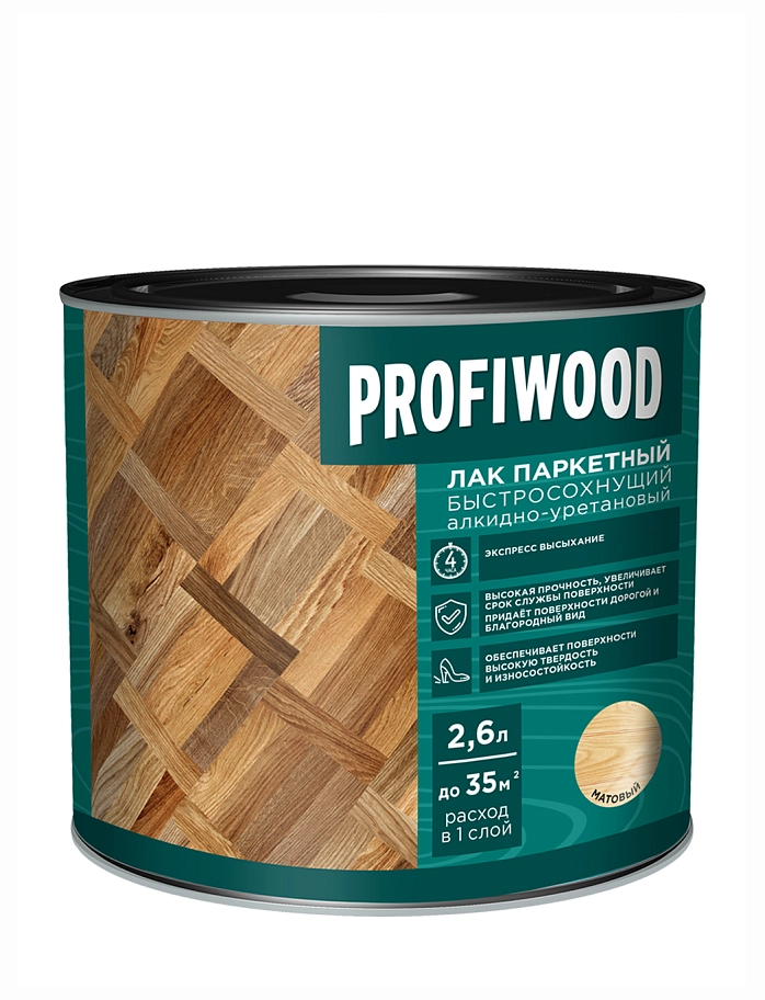 Алкидно-уретановый паркетный лак PROFIWOOD быстросохнущий предназначен для защиты и декоративной отделки паркетных и деревянных полов, а также для отделки деревянных поверхностей (мебели, дверей, лестниц), эксплуатируемых как внутри помещений, так и в атмосферных условиях.