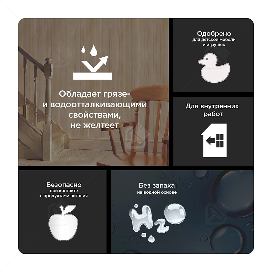 Придает поверхности отличный декоративный вид, подчеркивая естественную структуру древесины. Не желтеет и не темнеет со временем. Быстро высыхает на поверхности, окрасочные работы можно провести за 1 день.