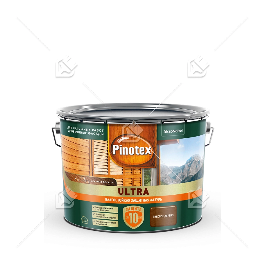 Купить декоративную пропитку для защиты древесины Pinotex Ultra в Москве теперь стало еще проще. Pinotex Ultra — это влагостойкая защитная лазурь для дерева, обеспечивающая до 10 лет защиты. Эта пропитка всесезонная, с УФ-фильтром, препятствует грибковым заражениям и появлению плесени, образует эластичное полуглянцевое покрытие с грязе- и водоотталкивающими свойствами. Усиленная воском, она создает прочное и эластичное защитное покрытие, которое не растрескивается.