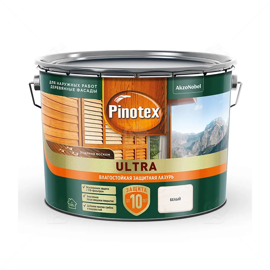 Купить декоративную пропитку для защиты древесины Pinotex Ultra в Москве теперь стало еще проще. Pinotex Ultra — это влагостойкая защитная лазурь для дерева, обеспечивающая до 10 лет защиты. Эта пропитка всесезонная, с УФ-фильтром, препятствует грибковым заражениям и появлению плесени, образует эластичное полуглянцевое покрытие с грязе- и водоотталкивающими свойствами. Усиленная воском, она создает прочное и эластичное защитное покрытие, которое не растрескивается.