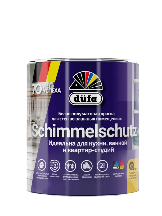ПодробнееКраска для стен и потолков для влажных помещений водно-дисперсионная Dufa Schimmelchutz полуматовая 0,9 л.